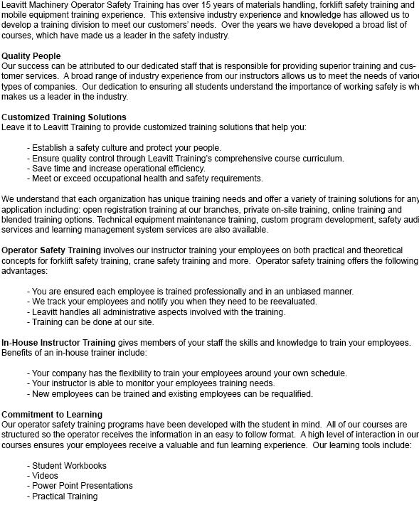 We provide a range of alternatives to help teach your workers. Training can be conducted at our site or at your facility. Our experienced employees can tailor our training to your specific equipment at your location of business.